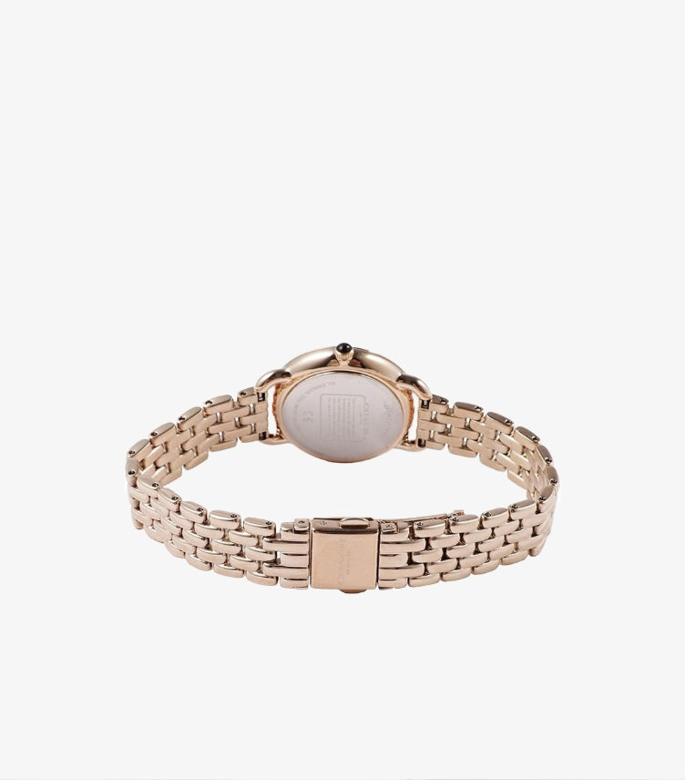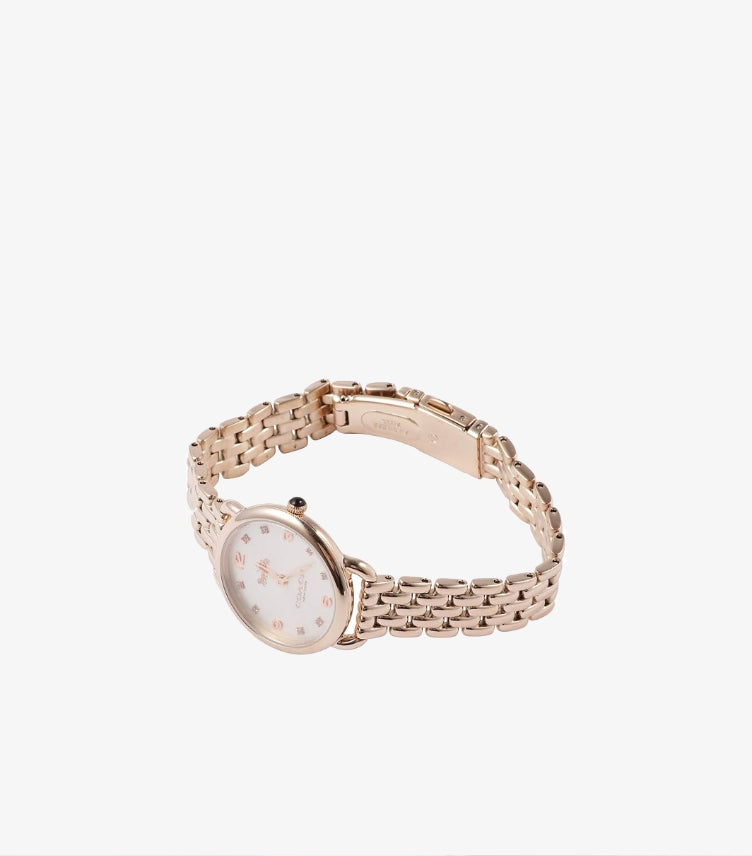 The Delancey collection is named after one of New York City's historic streets. This specific timepiece features an Ionic Rose Gold-Plated stainless steel case and a matching seven-link bracelet. Its design includes a sleek white dial accented by diamond-shaped hour markers and the iconic Coach horse and carriage logo