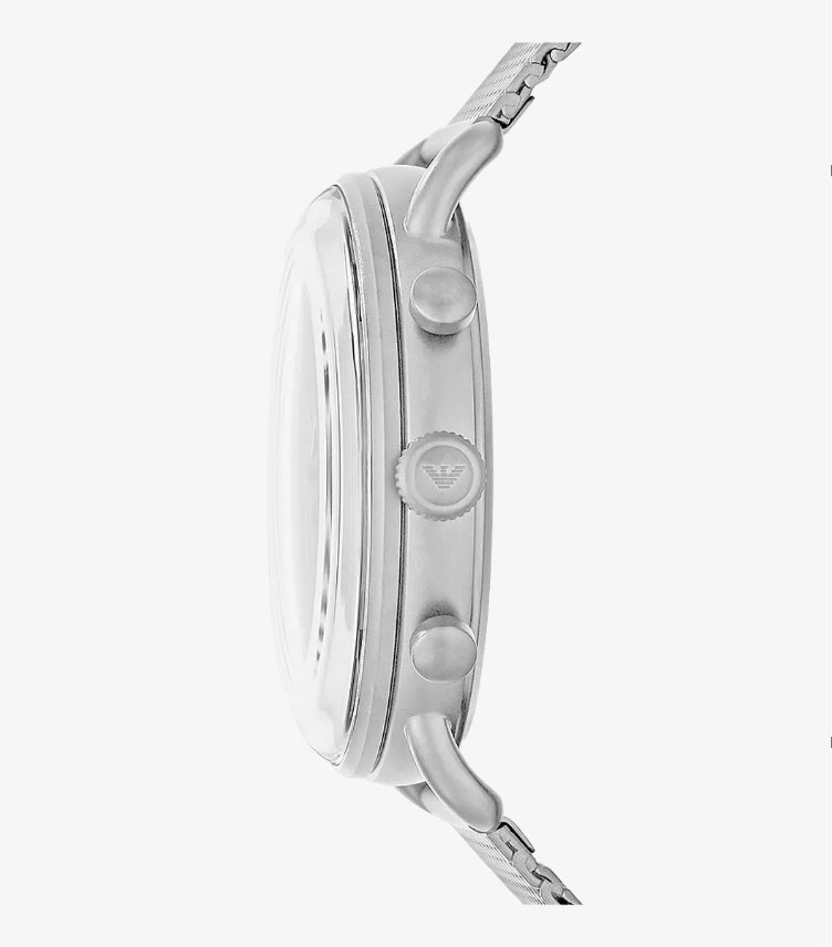 Emporio Armani's 43mm watch features a grey sunray dial with black stick indexes and blue tachymeter seconds tracker, chronograph movement and mesh stainless steel bracelet.
