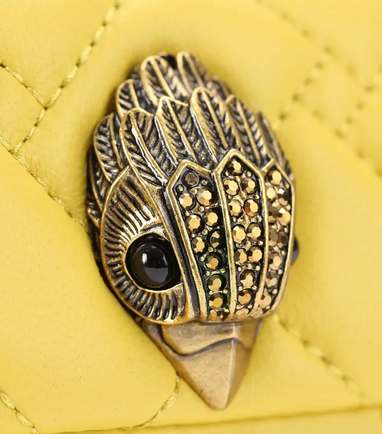 The Leather Mini Kensington bag is crafted from a yellow leather with overstitch quilting combining both weave and chevron patterns. The antiqued brass eagle head sits on the front flap.
