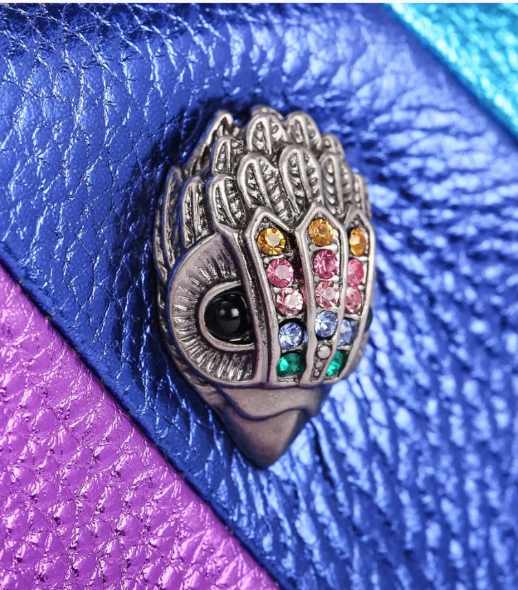 The Zip Around Wallet Eagle is crafted from a metallic laminated pebble grain cow leather in the iconic diagonal rainbow sewn stripe pattern. The antiqued silver Eagle head features rainbow coloured crystals and black bead eyes on the front.