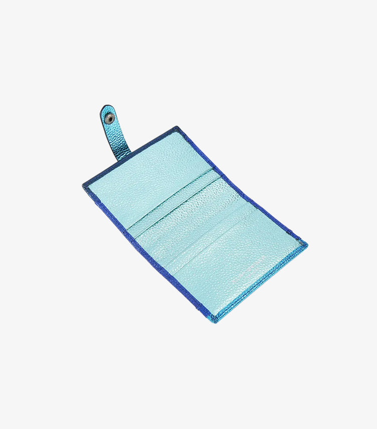 The Multi Card Holder is crafted from shades of blue metallic laminated pebble grain cow leather. The antiqued silver eagle head features blue crystals and black bead eyes which sits on the closure.