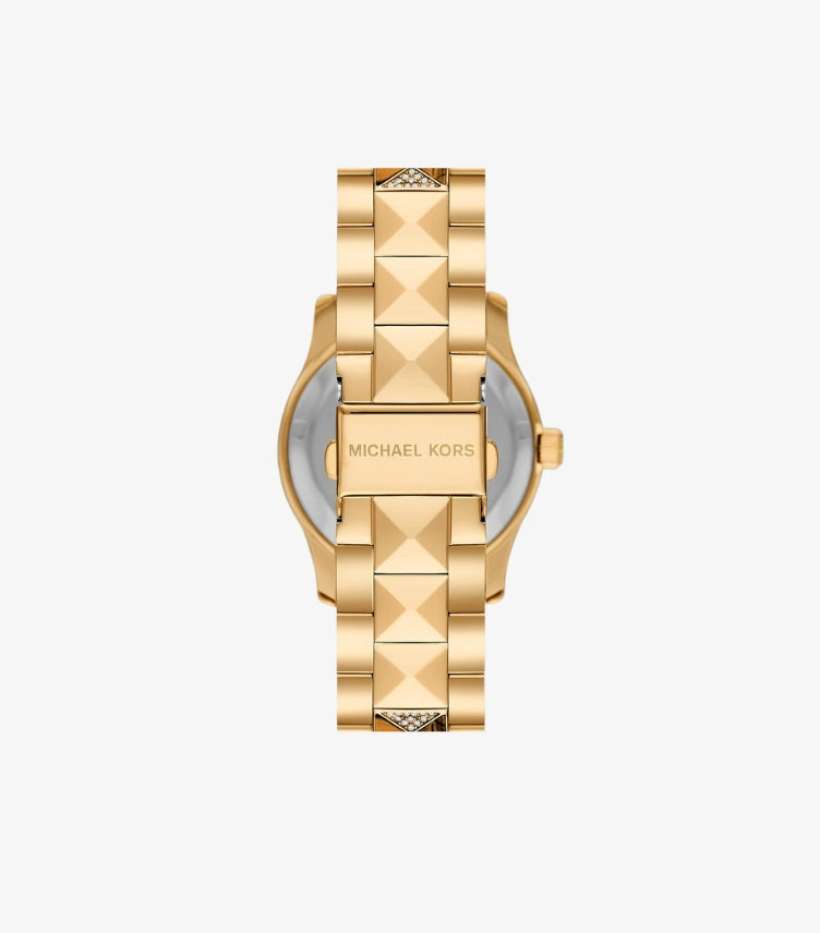 Michael Kors' 38mm Runway watch features a faux tiger's eye dial, three-hand movement, gold-tone stainless steel bracelet with faux tiger's eye, pavé pyramid centerlinks and a pavé topring.