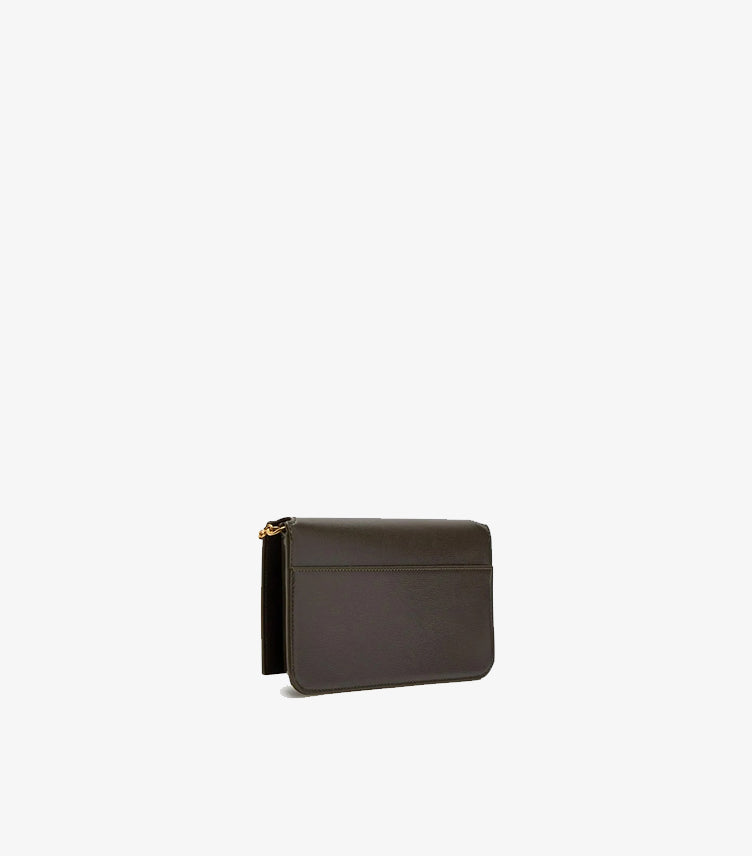 Saint Laurent leather clutch. Crafted in a refined greige tone, this clutch features a sleek structured silhouette accented with the iconic gold YSL logo.